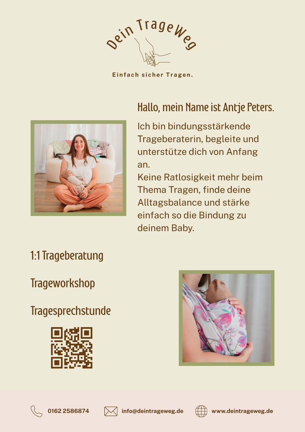 Du wünschst du dir mehr Nähe, Sicherheit und Leichtigkeit im Alltag mit deinem Baby – hier begleitet dich Antje Peters mit Dein Trageweg. Als bindungsstärkende Trageberaterin unterstützt sie werdende Eltern und Familien, das Tragen von Anfang an sicher und liebevoll zu gestalten. Mit Einfühlungsvermögen, Ruhe und Fachwissen hilft Antje, Unsicherheiten loszulassen und deinen eigenen Trageweg zu finden. In der 1:1-Trageberatung, in Workshops oder in der Tragesprechstunde nimmt sie sich Zeit für dich, deine Fragen und eure Bedürfnisse – für mehr Vertrauen, Nähe und Verbundenheit im Familienalltag.