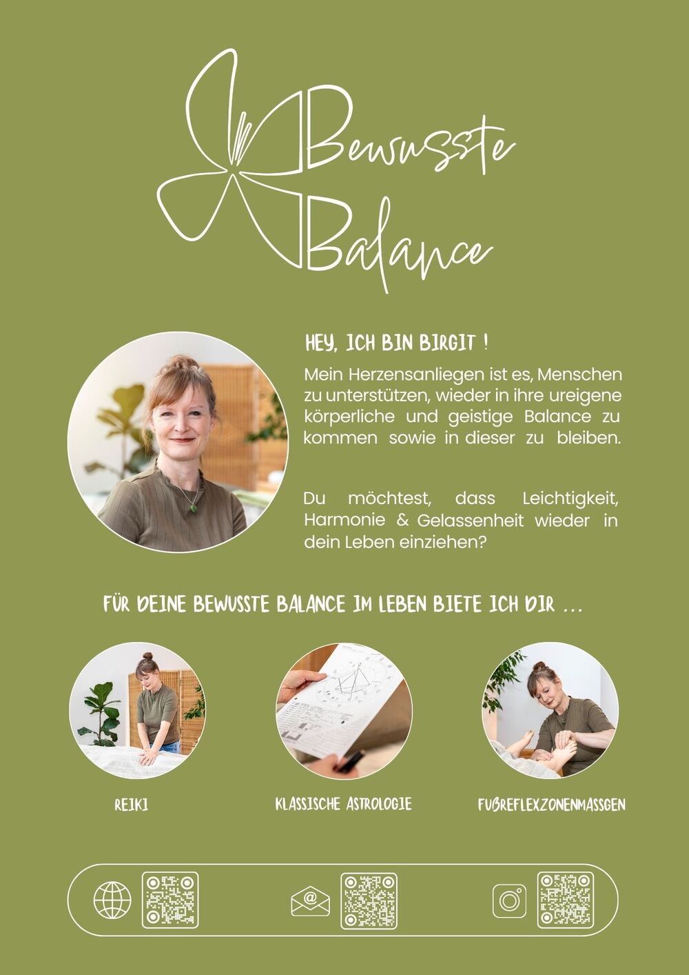 Bewusste Balance bedeutet, dir Zeit zu nehmen – für dich, dein Wohlbefinden und dein inneres Gleichgewicht. Birgit schafft genau diesen Raum. Mit viel Achtsamkeit, Intuition und Herz begleitet sie dich dabei, loszulassen, neue Kraft zu schöpfen und deine innere Balance wiederzufinden.